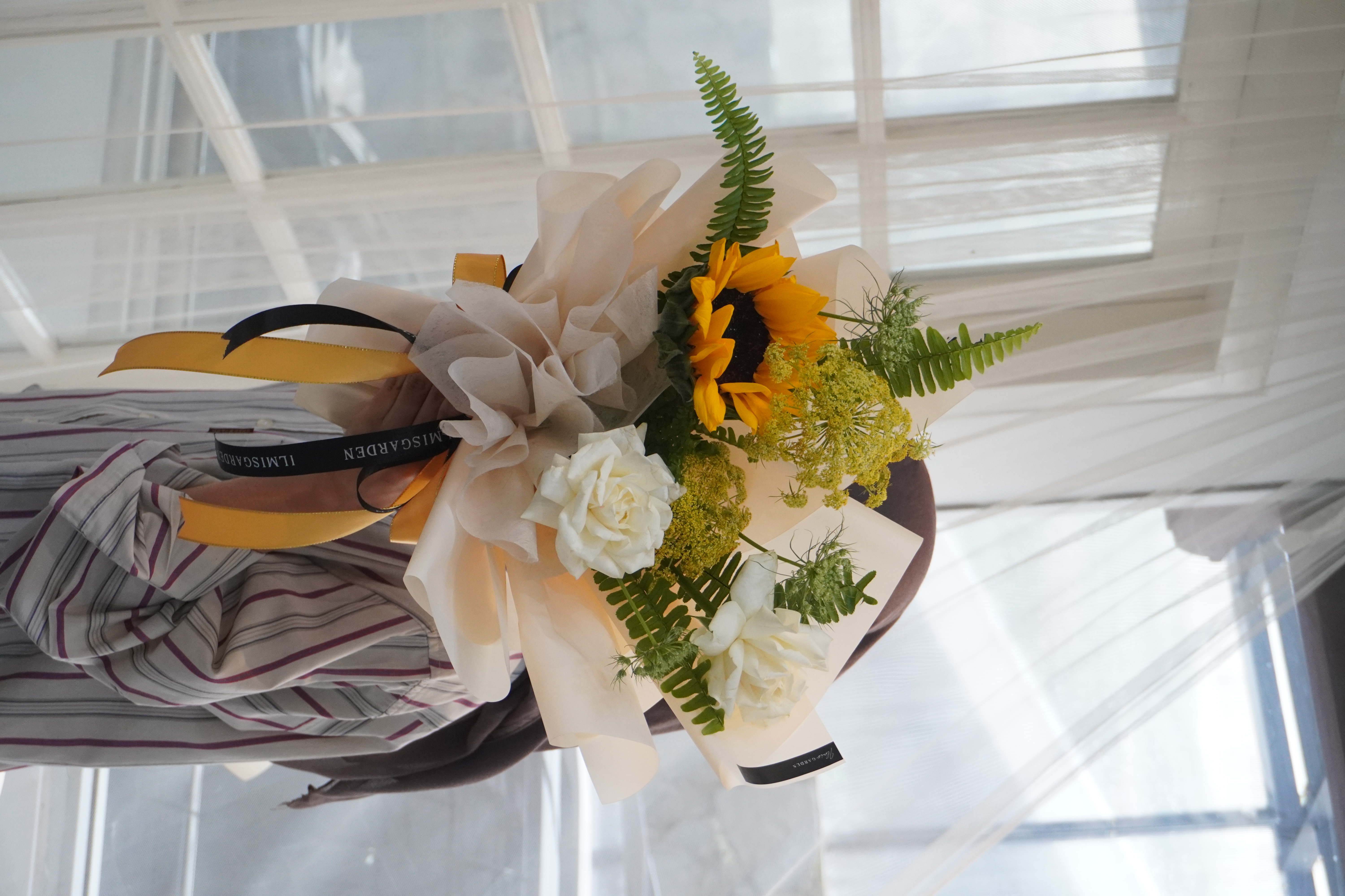Bouquet ini disusun dari bunga matahari, mawar, dan daun sebagai filler nya.