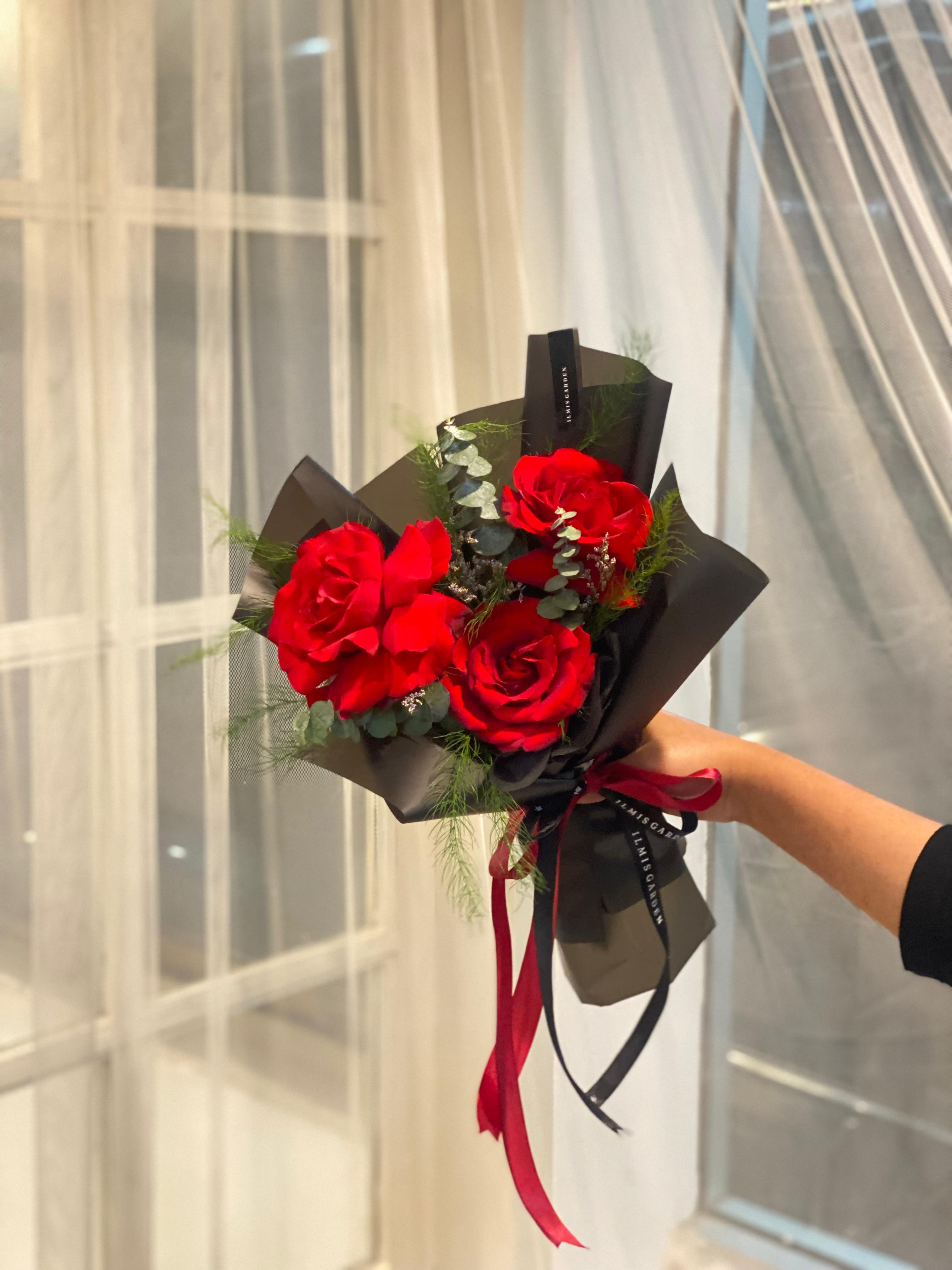 Bouquet ini terdiri dari 3 tangkai mawar, dan filler.