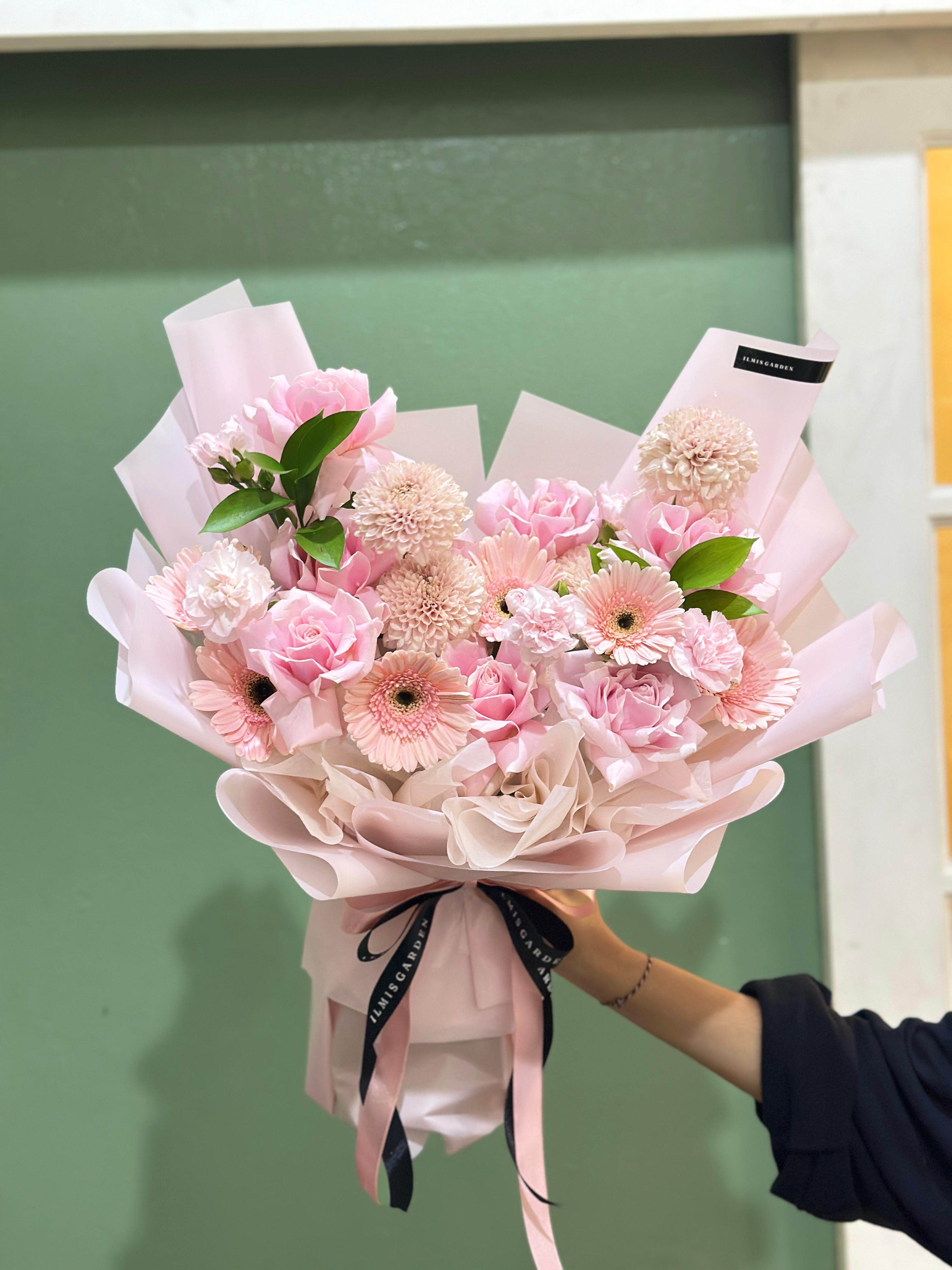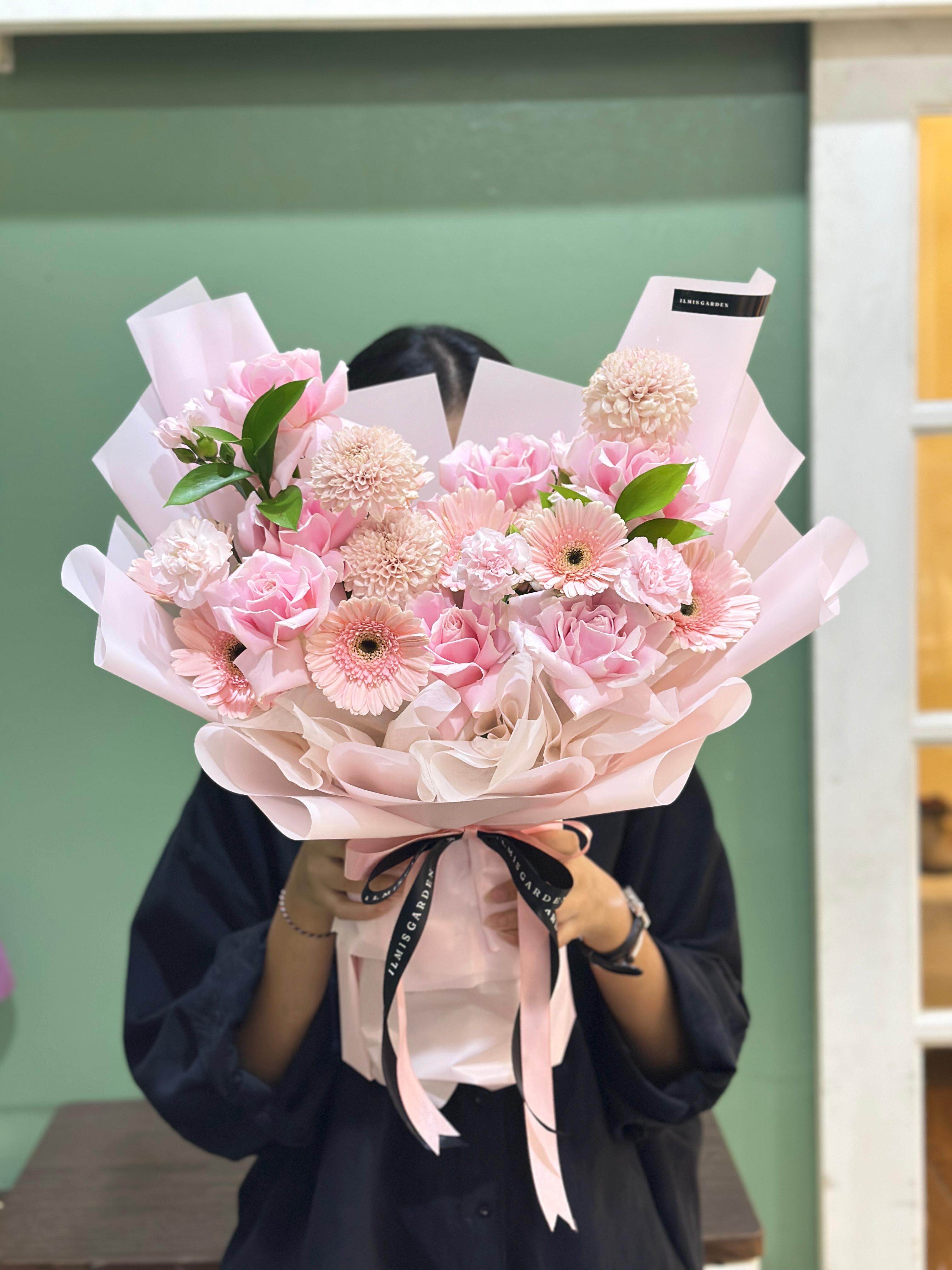 Disusun dengan kombinasi mawar pink, gerbera, gompie, dan carnation yang menambah tekstur manis pada rangkaian.