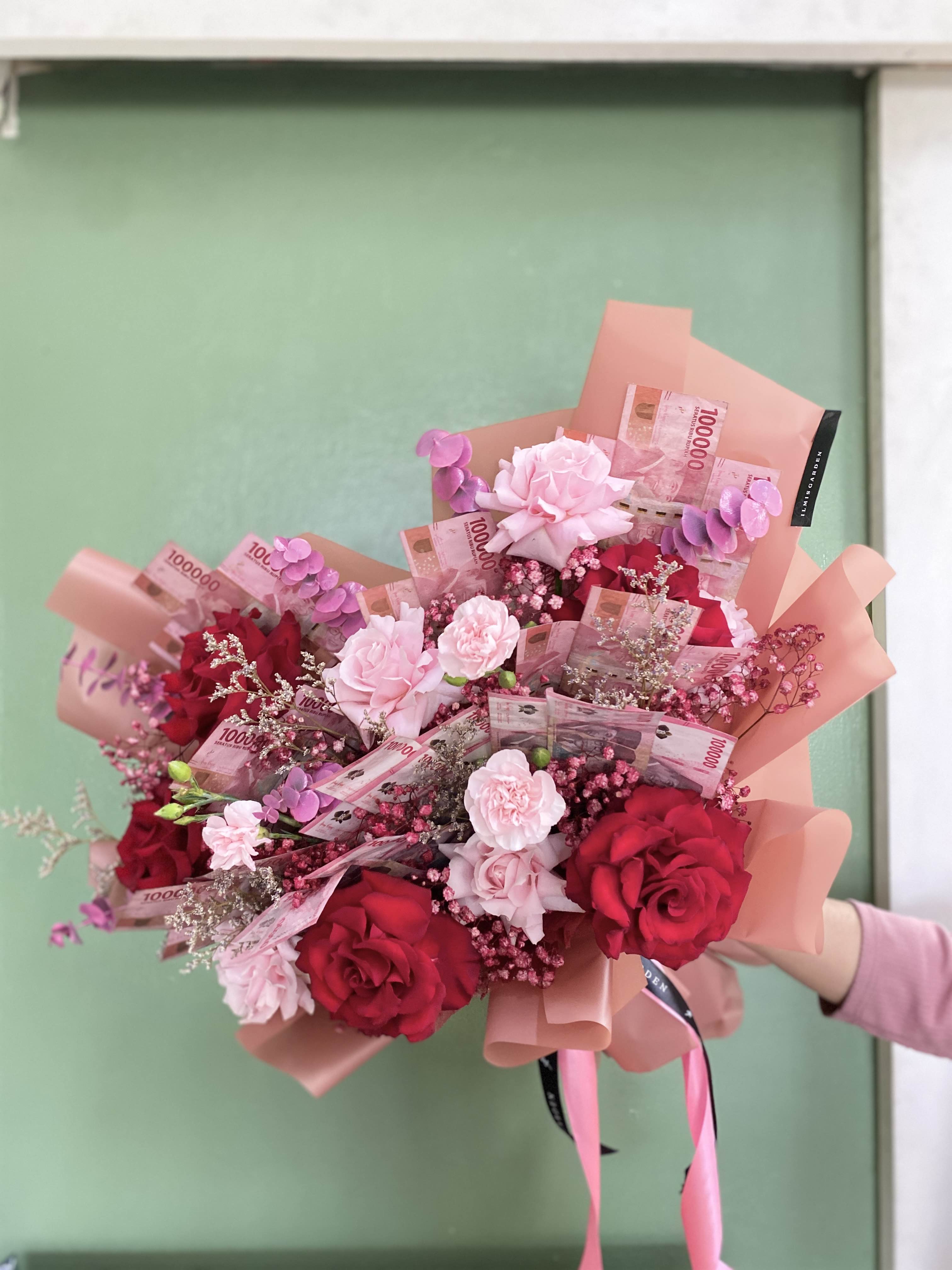 Dusty Money Bouquet adalah buket eksklusif yang memadukan lembaran uang tersusun rapi dengan bunga segar, menghadirkan kesan mewah, elegan dan penuh makna.