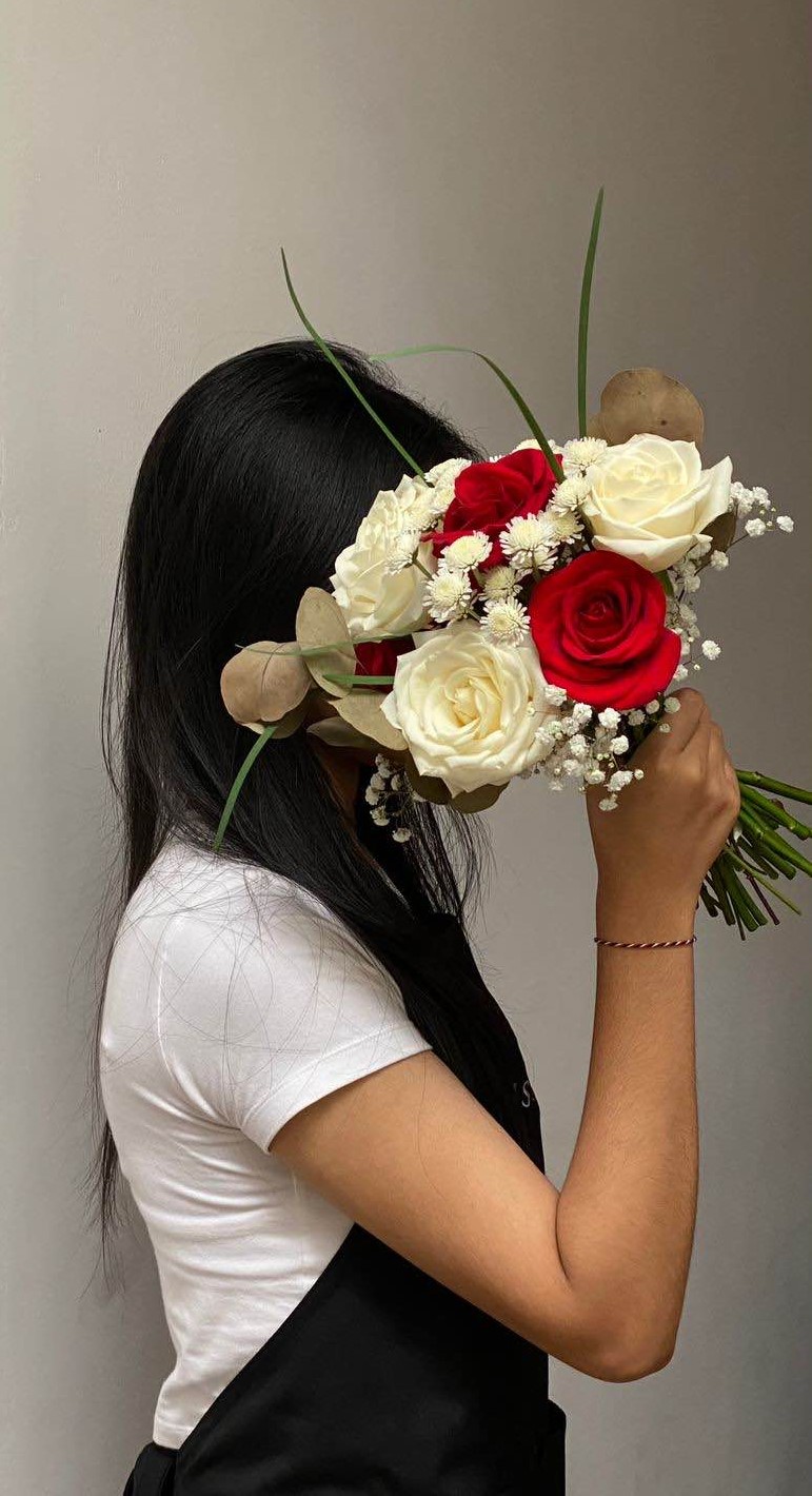 Amour Classic bernuansa merah & putih yang menampilkan kesan elegan, tegas, dan penuh makna. Rangkaian ini terdiri dari mawar merah yang melambangkan cinta dan keberanian, dipadukan dengan mawar putih sebagai simbol ketulusan dan kemurnian. Sentuhan baby breath putih, calimero kecil, serta aksen daun eucalyptus kering memberikan tekstur alami yang seimbang dan mempercantik tampilan keseluruhan.
