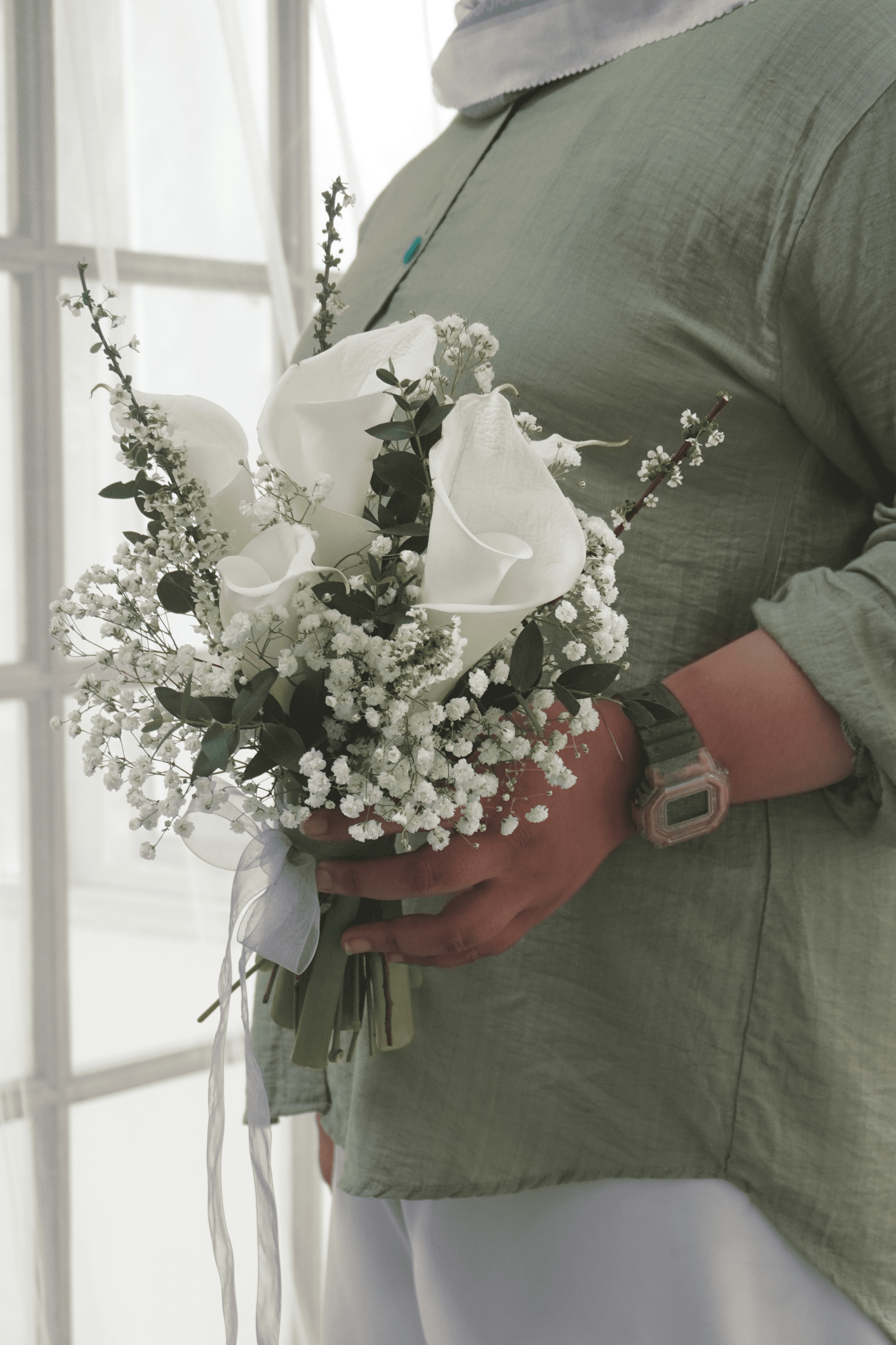 Calla lily dikenal sebagai simbol kemurnian, kesetiaan, dan keanggunan, menjadikan buket ini pilihan sempurna untuk momen sakral pernikahan. Dibalut pita organza lembut, buket ini tampil klasik dan sophisticated tanpa kesan berlebihan.