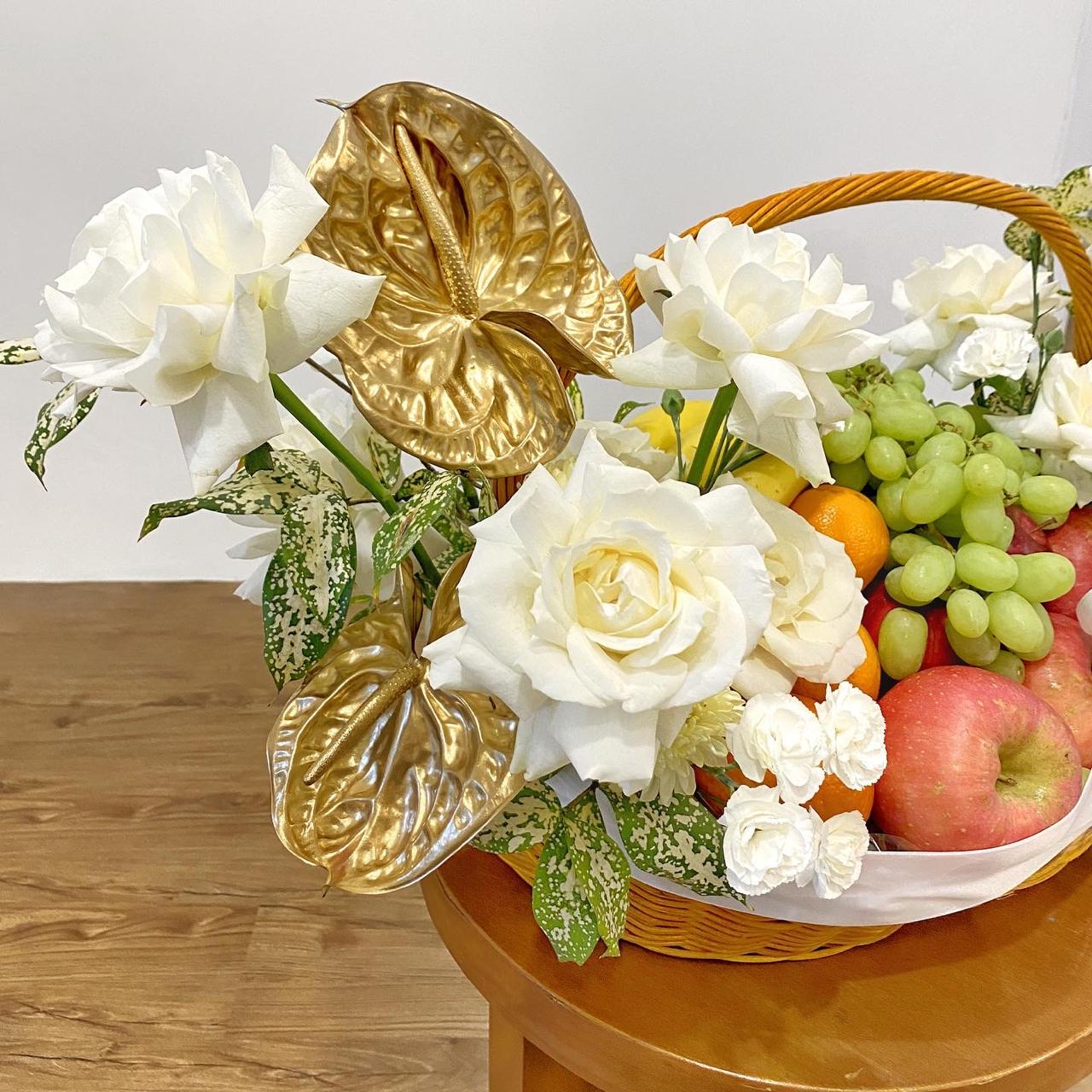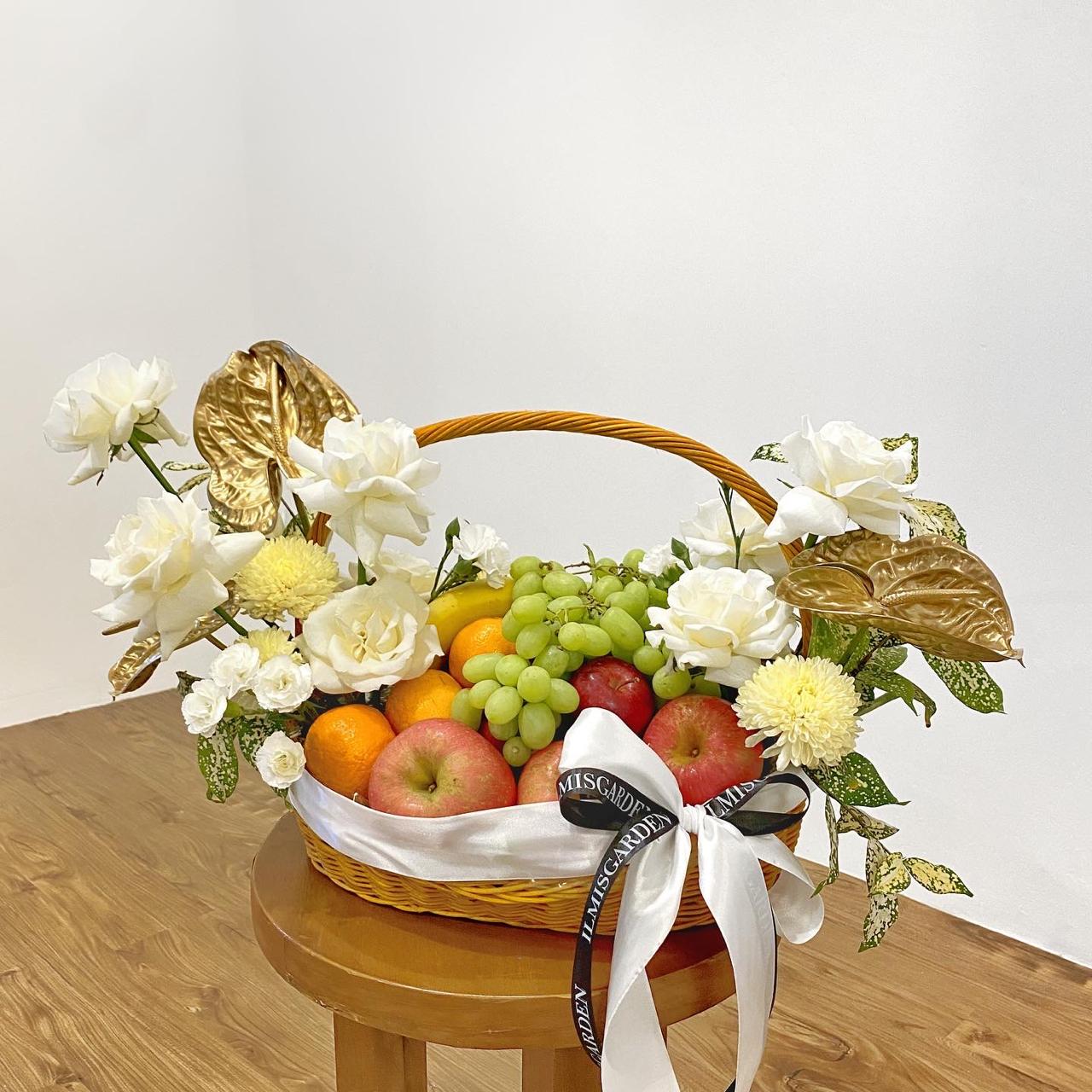 Rangkaian Tuty Fruty Basket ini memadukan kesegaran buah pilihan dengan sentuhan bunga bernuansa putih-emas yang elegan. Disusun dalam keranjang berisi apel merah, anggur hijau, jeruk, dan pisang yang tertata rapi, dilengkapi bunga mawar putih, krisan, serta aksen daun dekoratif berwarna emas yang memberi kesan mewah. Sentuhan pita khas Ilmis Garden mempermanis tampilan sekaligus menghadirkan kesan eksklusif. Cocok sebagai hampers ucapan cepat sembuh, hadiah keluarga, atau tanda perhatian yang hangat dan berkelas.