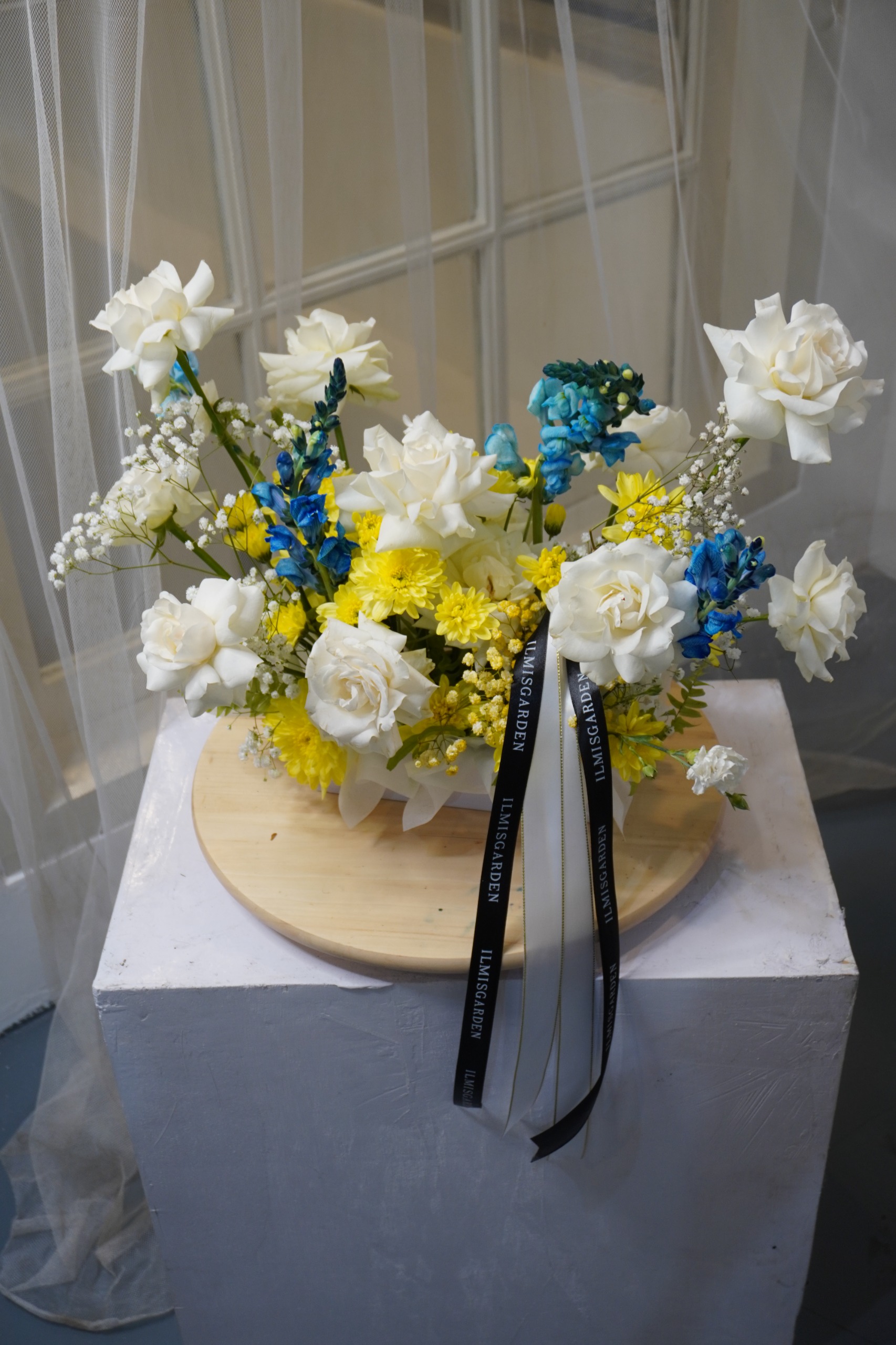Rangkaian centerpiece ini menghadirkan perpaduan warna putih, kuning, dan biru yang segar dan menenangkan. Disusun dengan mawar putih elegan, krisan kuning cerah, baby breath, serta sentuhan snapdragon biru yang memberi kontras lembut dan modern. Diletakkan dalam box minimalis dengan aksen pita khas ilmisgarden, rangkaian ini memancarkan kesan hangat, optimis, dan penuh ketulusan. Cocok sebagai hadiah ucapan terima kasih, semangat baru, ulang tahun, maupun ungkapan perhatian yang tulus dan berkelas.