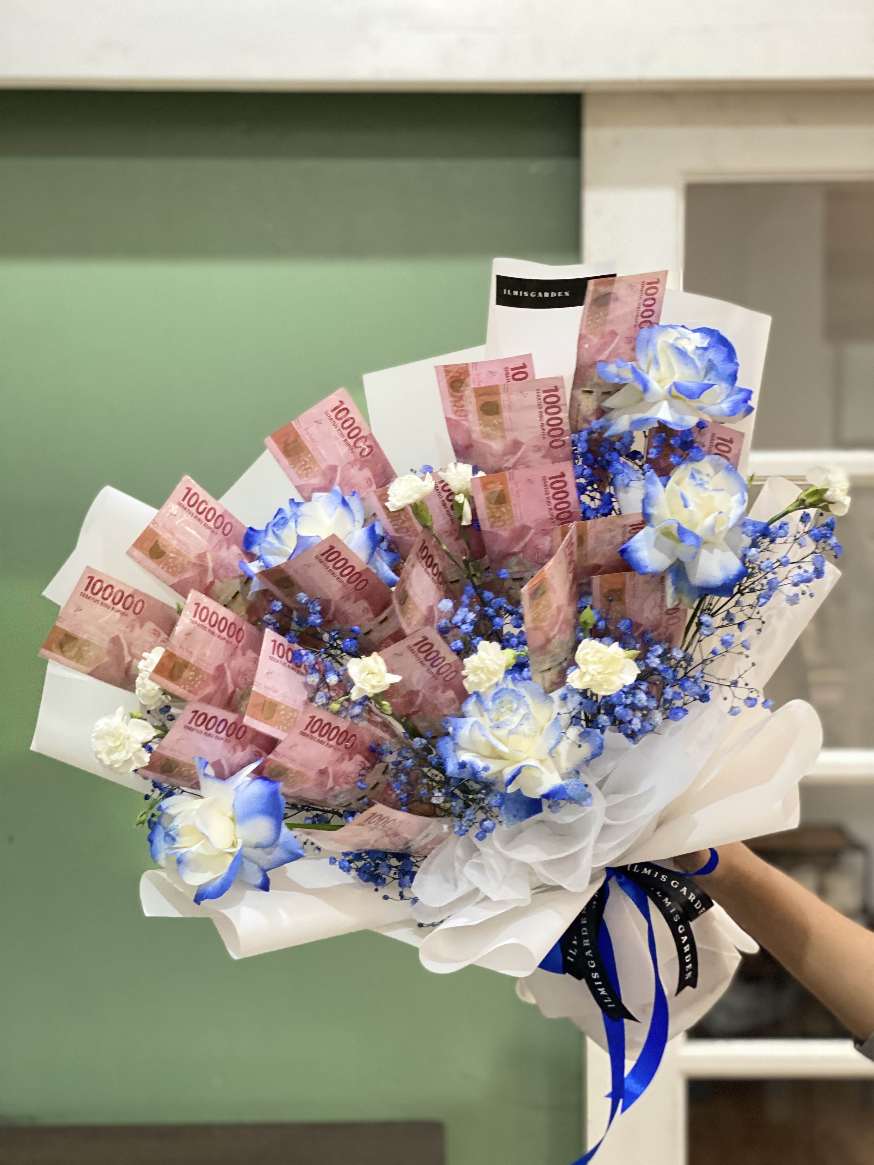 Blue Horizon Money Bouquet ini dirancang dengan perpaduan warna biru dan putih yang segar dan elegan, menampilkan lembaran uang 20 lembar yang disusun rapi sebagai elemen utama, dipadukan dengan bunga fresh bernuansa biru–putih serta baby breath biru sebagai aksen. Rangkaian ini melambangkan doa kemakmuran, ketenangan, dan harapan baik untuk masa depan. Cocok sebagai hadiah wisuda, ulang tahun, maupun momen spesial yang ingin dikenang dengan kesan berkelas dan berharga.