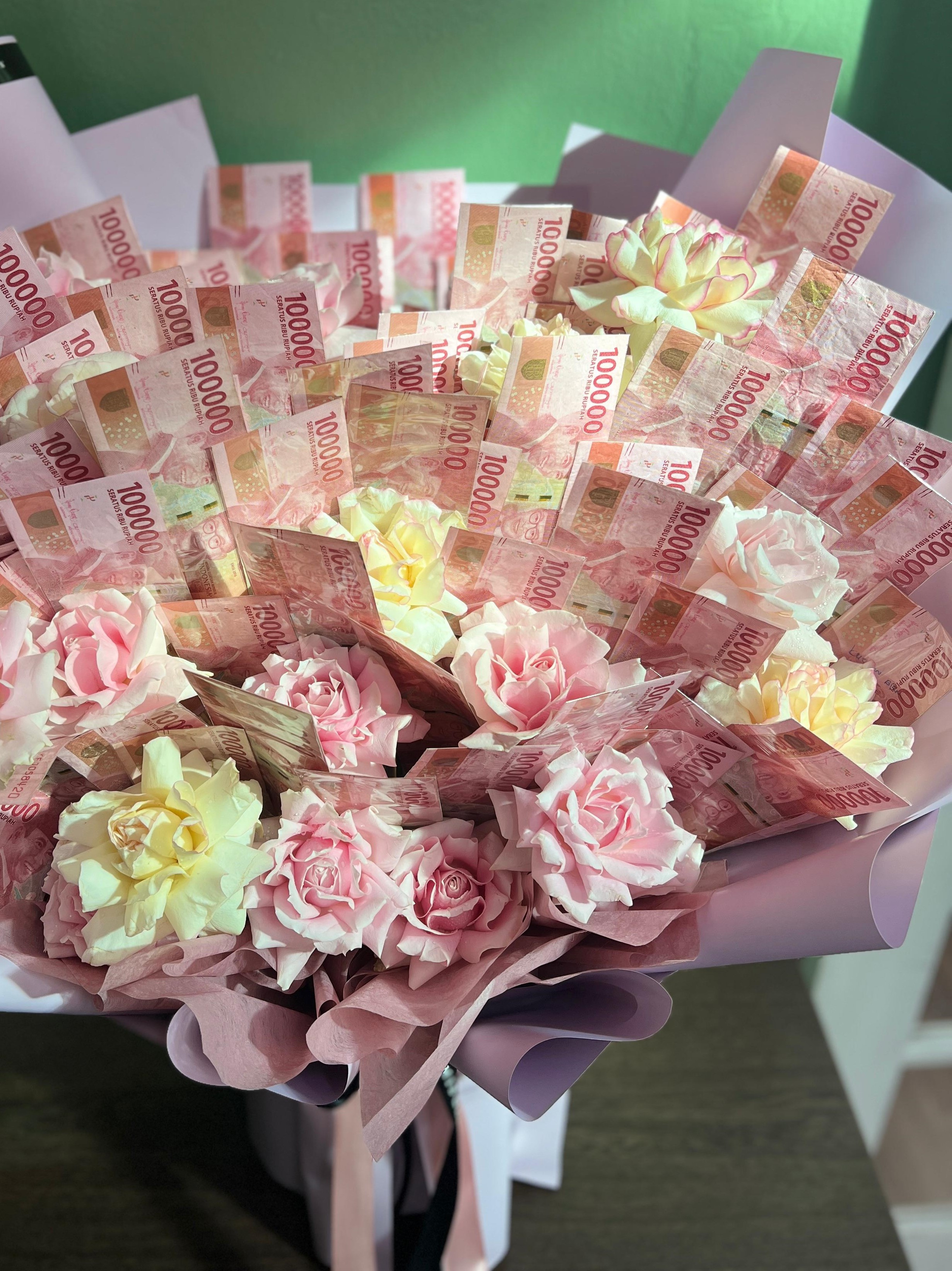 Deluxe Money Bouquet ini menampilkan uang 100 lembar yang disusun rapi dipadukan dengan mawar pink dan mawar putih. Dominasi warna pastel memberikan kesan tenang, dan modern. Rangkaian ini tidak hanya menarik secara visual, tetapi juga melambangkan doa kemakmuran, harapan baik, dan keberuntungan. Cocok dijadikan hadiah wisuda, ulang tahun, atau perayaan pencapaian spesial dengan sentuhan yang berbeda dan berkesan.