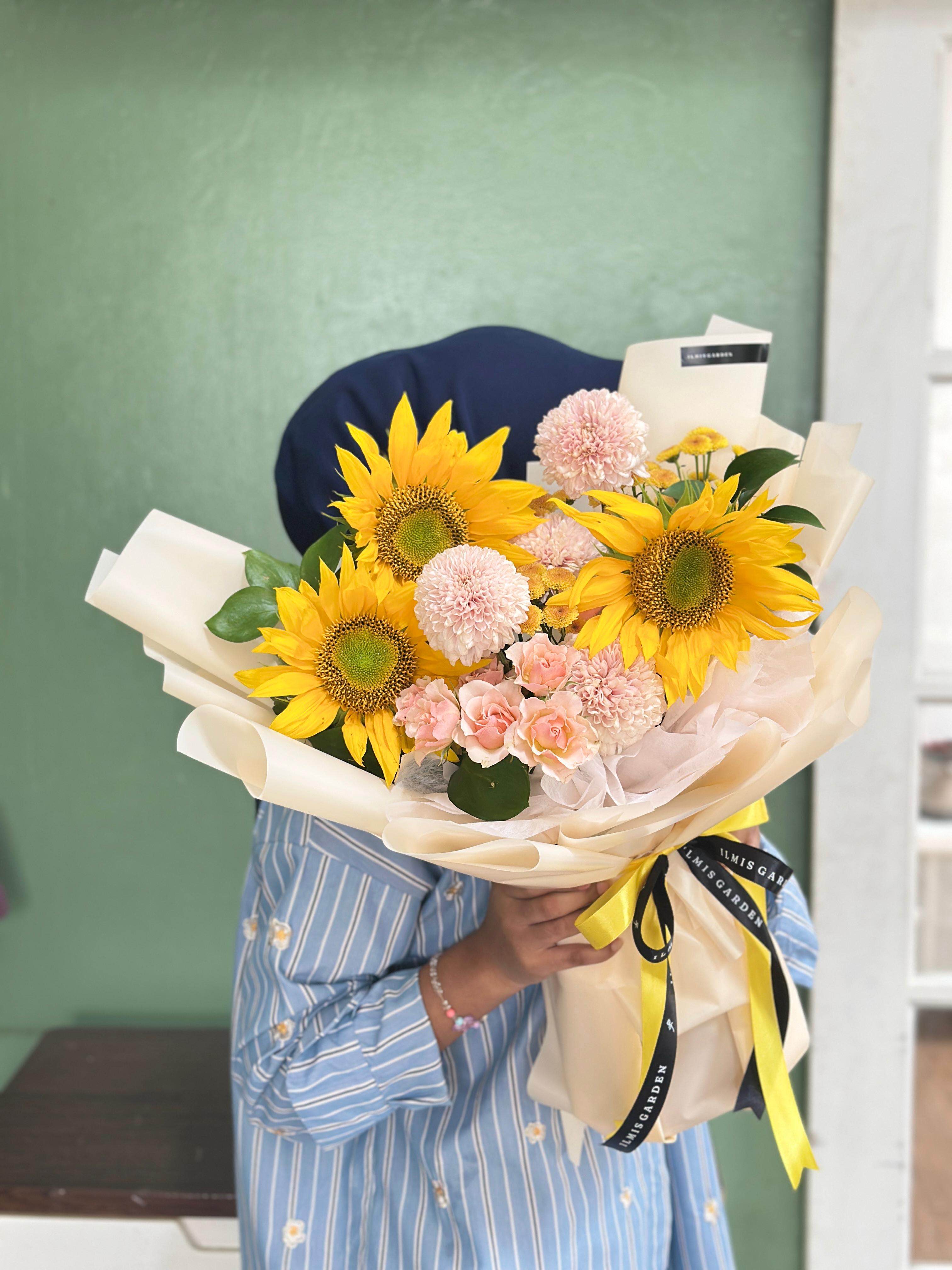 Perpaduan cerah sunflower dan sentuhan pastel pink yang menghadirkan energi positif dan kehangatan di bouquet ini. Melambangkan kebahagiaan, harapan baru, dan ketulusan, buket ini cocok untuk mengirim semangat dan merayakan momen spesial, seperti ulang tahun, graduation, ucapan semangat, apresiasi, dll.