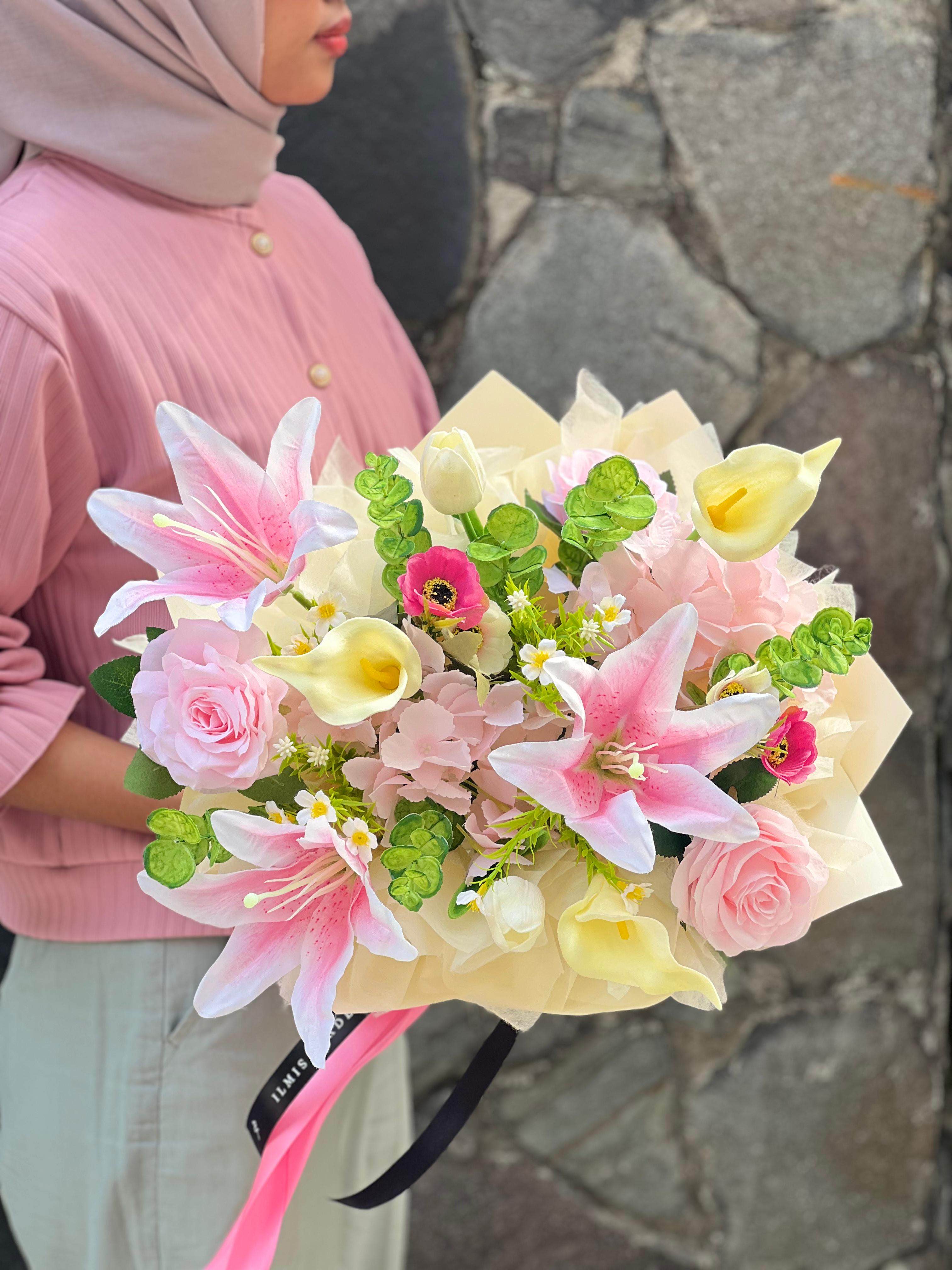 Rangkaian bunga artificial premium bernuansa pastel dengan perpaduan lily, mawar, dan calla lily yang tampak natural dan elegan. Bouquet artificial flowers ini tahan lama tanpa perawatan, warna tidak mudah pudar, dan aman untuk penerima alergi bunga. Hadiah sempurna untuk ulang tahun, wisuda, anniversary, atau dekorasi ruangan sebagai simbol cinta dan kehangatan yang abadi.