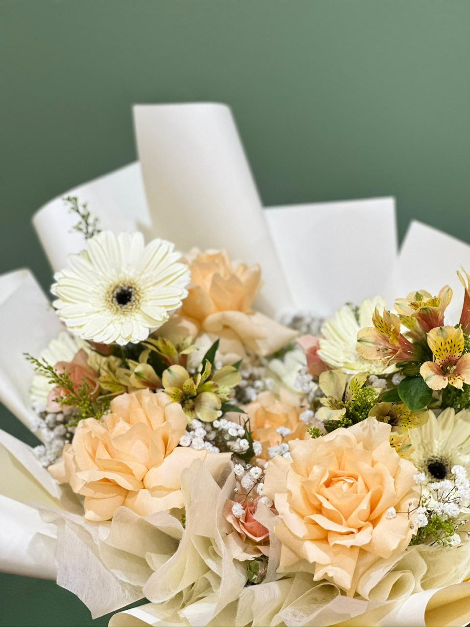 Medium Peachy Bouquet adalah rangkaian bunga lembut bernuansa peach dan ivory yang membawa kesan hangat dan menenangkan. Perpaduan mawar peach, gerbera putih, alstroemeria, dan baby breath menciptakan tampilan romantis yang elegan, simbol kasih sayang tulus dan harapan baik untuk masa depan.