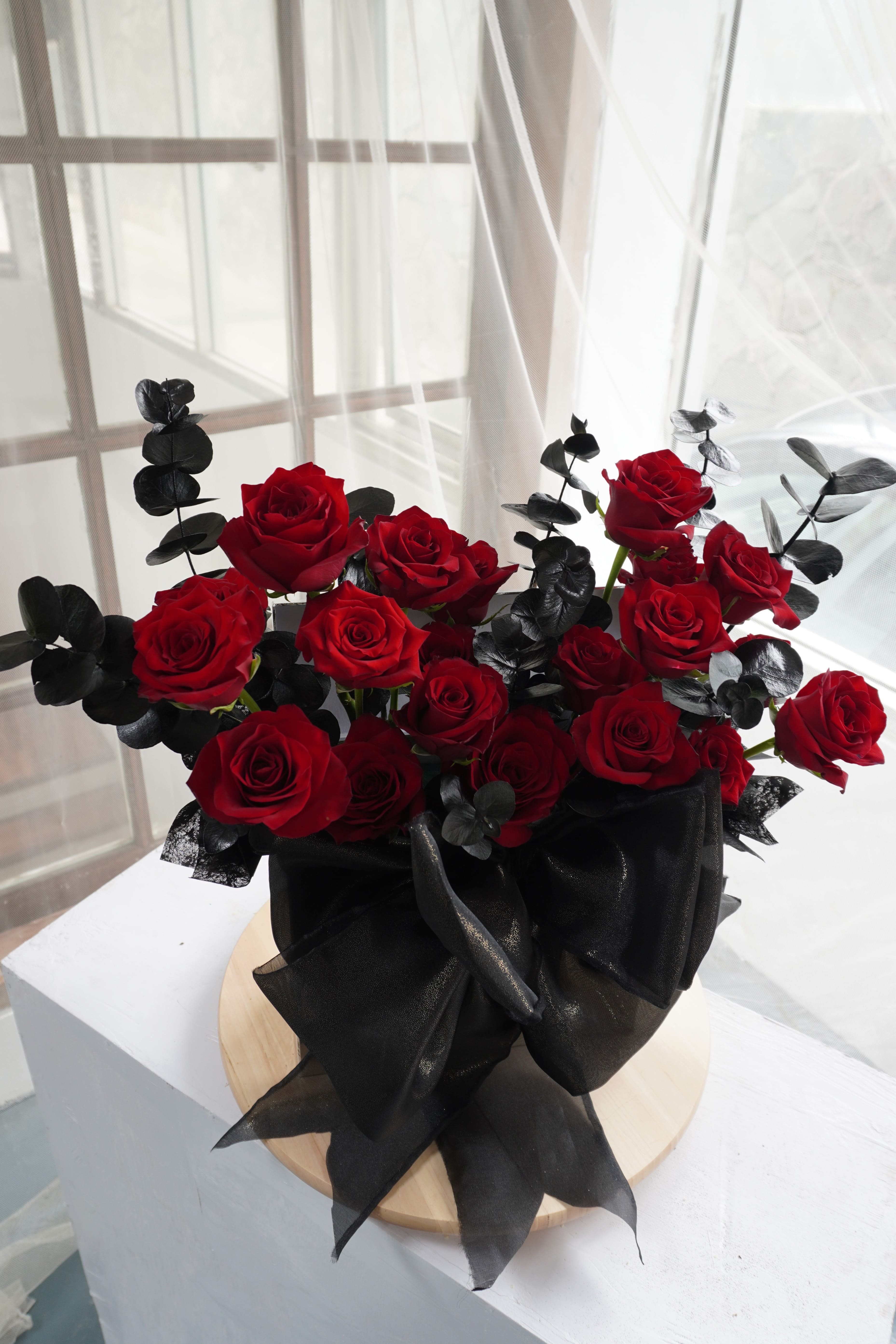 Elegance Noir Bloom Box adalah rangkaian bunga dalam box yang memadukan keanggunan mawar merah premium dengan sentuhan eksotis eucalyptus hitam. Komposisi warna kontras merah dan hitam menciptakan kesan dramatis, elegan, dan penuh kekuatan. Dihias dengan pita organza hitam berukuran besar yang mempertegas karakter mewah dan modern.