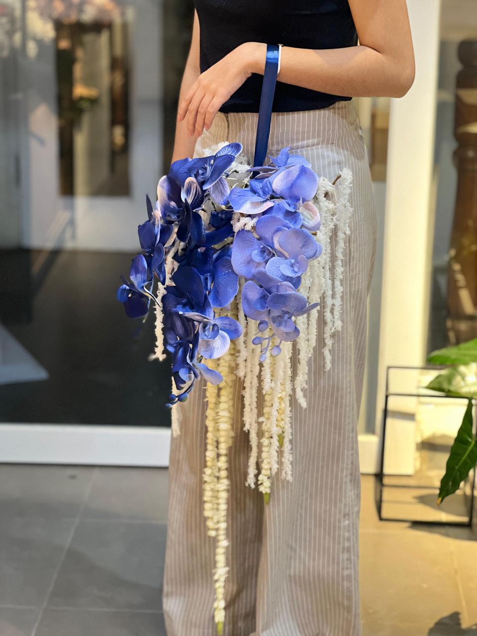 Royal Blue Jasmine Pomander Bouquet adalah buket pernikahan modern yang memadukan keanggunan artificial orchid biru, kemewahan artificial amaranthus, dan sentuhan sakral dari melati segar yang menjuntai lembut. Dirancang dengan gaya pomander, buket ini menciptakan siluet memanjang yang elegan, menjadikannya pilihan sempurna untuk pengantin yang ingin tampil standout dan penuh karakter.