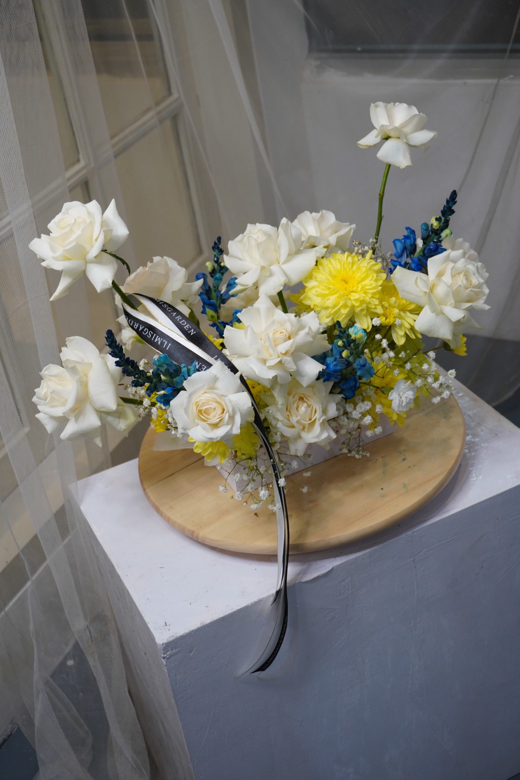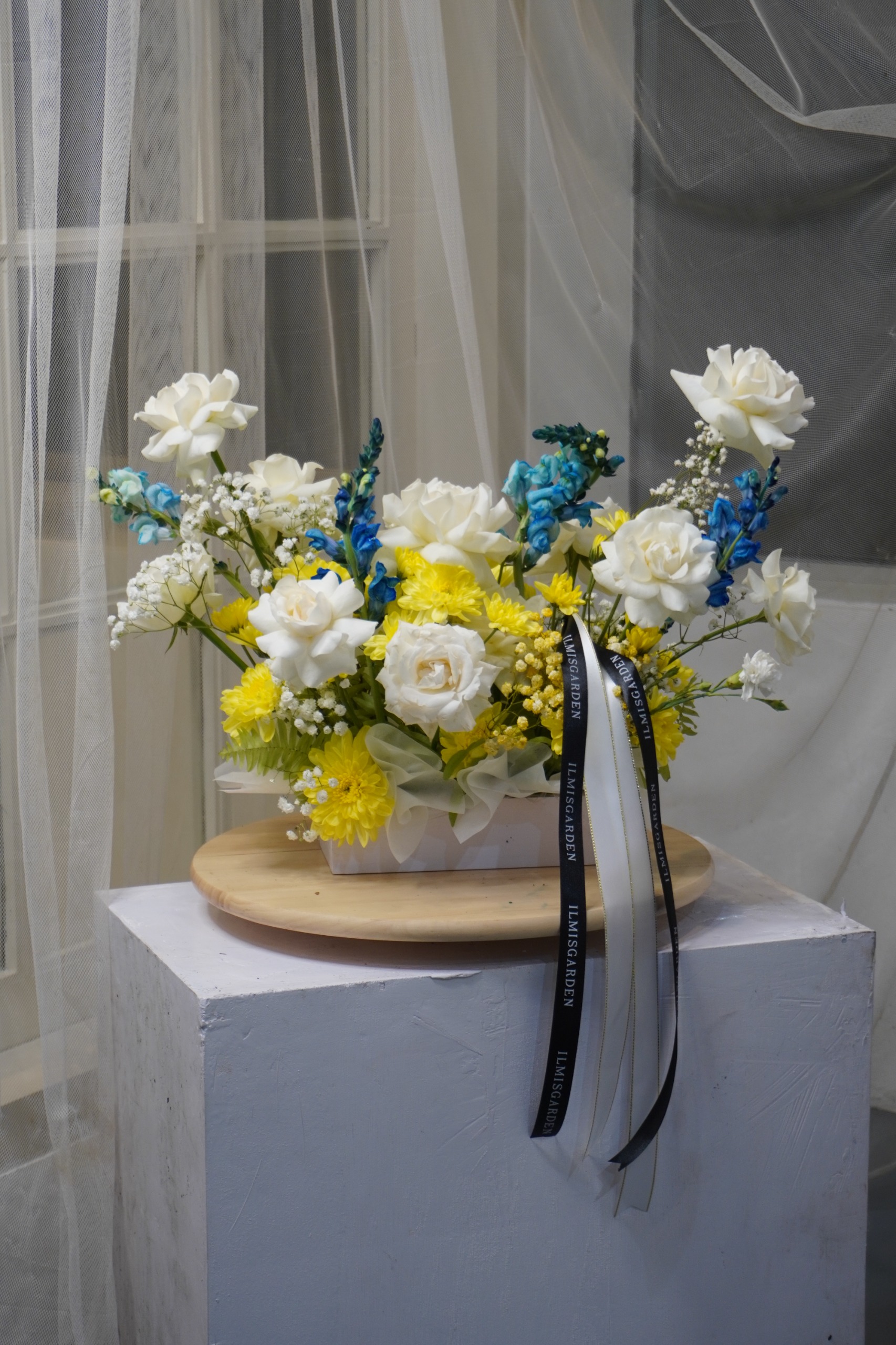 Rangkaian centerpiece ini menghadirkan perpaduan warna putih, kuning, dan biru yang segar dan menenangkan. Disusun dengan mawar putih elegan, krisan kuning cerah, baby breath, serta sentuhan snapdragon biru yang memberi kontras lembut dan modern. Diletakkan dalam box minimalis dengan aksen pita khas ilmisgarden, rangkaian ini memancarkan kesan hangat, optimis, dan penuh ketulusan. Cocok sebagai hadiah ucapan terima kasih, semangat baru, ulang tahun, maupun ungkapan perhatian yang tulus dan berkelas.