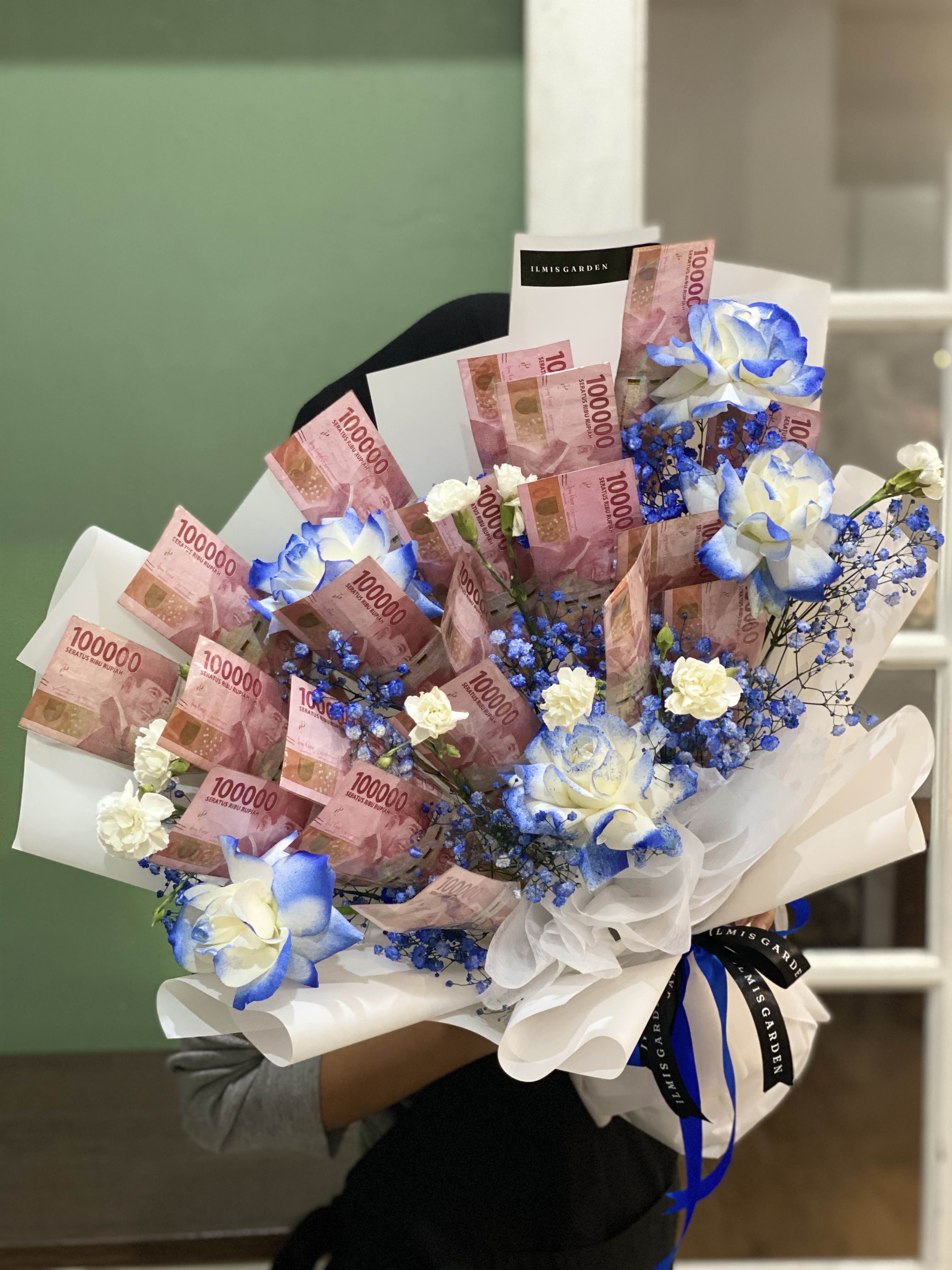 Blue Horizon Money Bouquet ini dirancang dengan perpaduan warna biru dan putih yang segar dan elegan, menampilkan lembaran uang 20 lembar yang disusun rapi sebagai elemen utama, dipadukan dengan bunga fresh bernuansa biru–putih serta baby breath biru sebagai aksen. Rangkaian ini melambangkan doa kemakmuran, ketenangan, dan harapan baik untuk masa depan. Cocok sebagai hadiah wisuda, ulang tahun, maupun momen spesial yang ingin dikenang dengan kesan berkelas dan berharga.